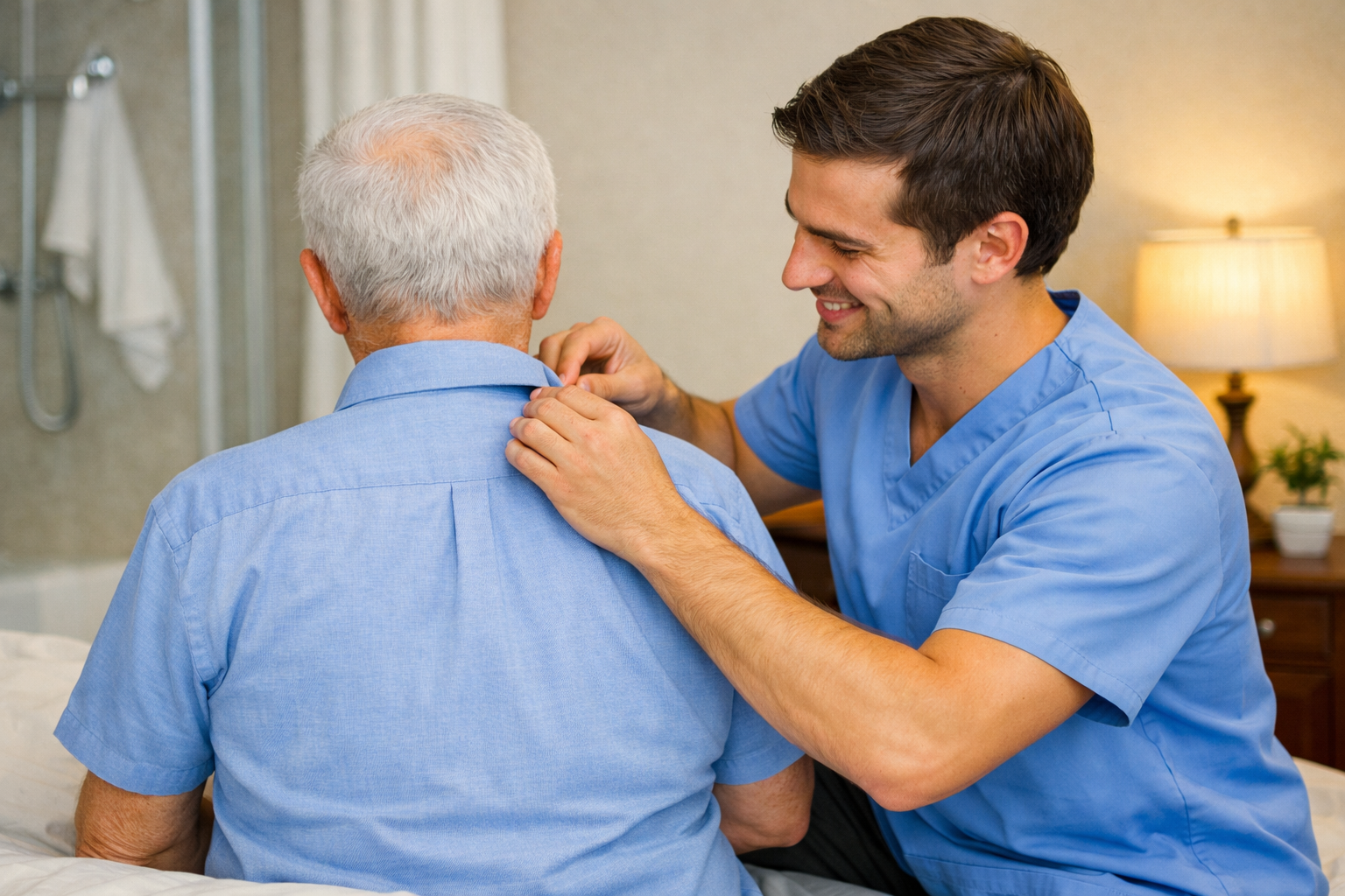 Assistência completa na higiene pessoal e na troca de roupas, garantindo conforto, dignidade e bem-estar diário.