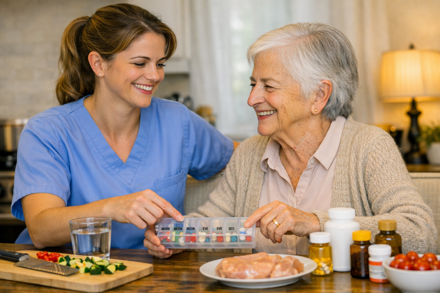 Organização e auxílio na administração correta dos medicamentos, assegurando disciplina e segurança no tratamento.